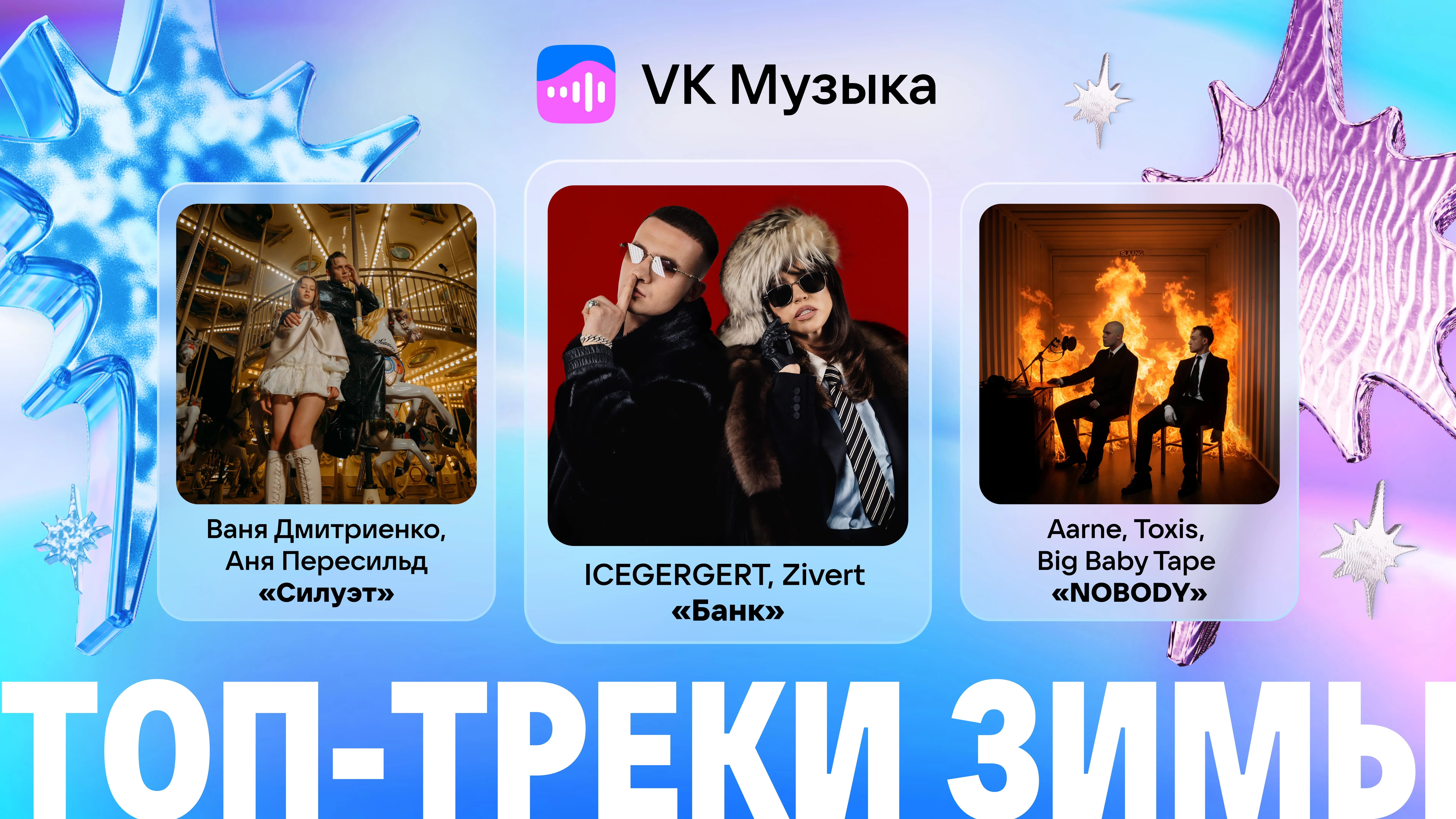 Самым популярным треком у всех поколений стал «Банк» от ICEGERGERT и Zivert. У слушателей моложе 25 лет в топе треки в жанрах рэп и хип-хоп: Aarne, Toxi$, Big Baby Tape — NOBODY и ЛСП — «Шиншиллы». Новый январский релиз «Наоборот» от Miyagi & Эндшпиль, группы 2025 года в стриминге, продолжает набирать популярность у молодёжи и находится в чарте в топ-5. Более взрослая аудитория — от 25 лет — в основном предпочитала треки с новогодней тематикой и поп-хиты: Betsy, Ded M — «Под Новый Год» и Ваня Дмитриенко, Аня Пересильд — «Силуэт» (из к/ф «Алиса в Стране чудес»). Редакция VK Музыки собрала два плейлиста с популярными треками у разных поколений — «Рождённые в XXI: новогодний топ» и «Рождённые в XX: новогодний топ».