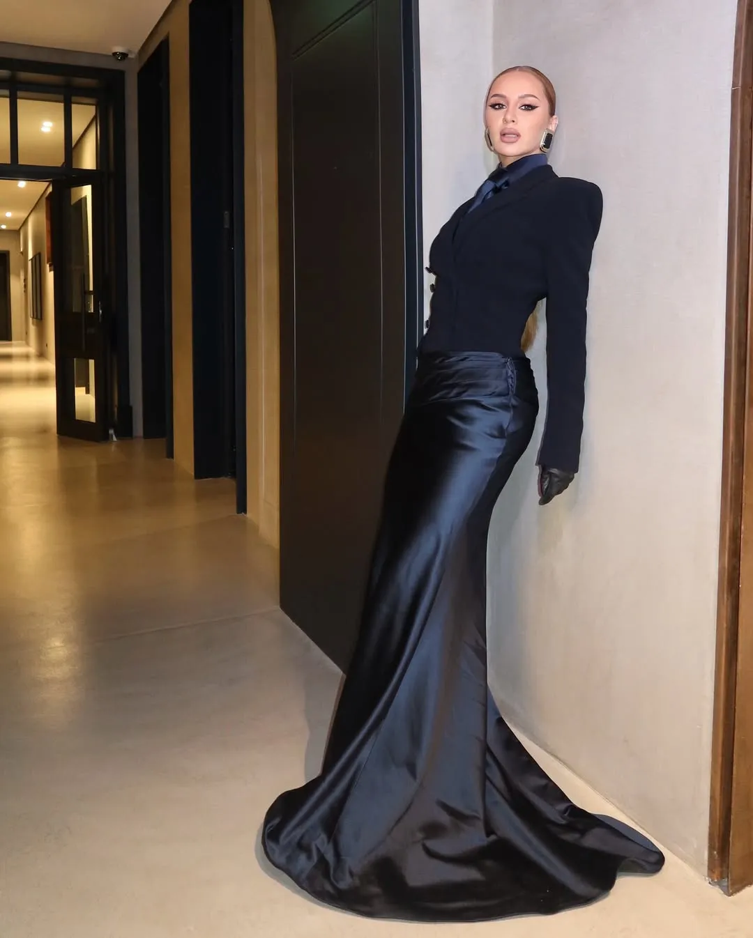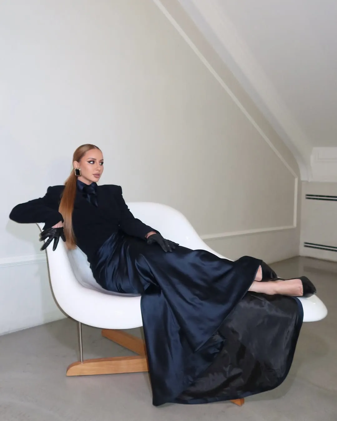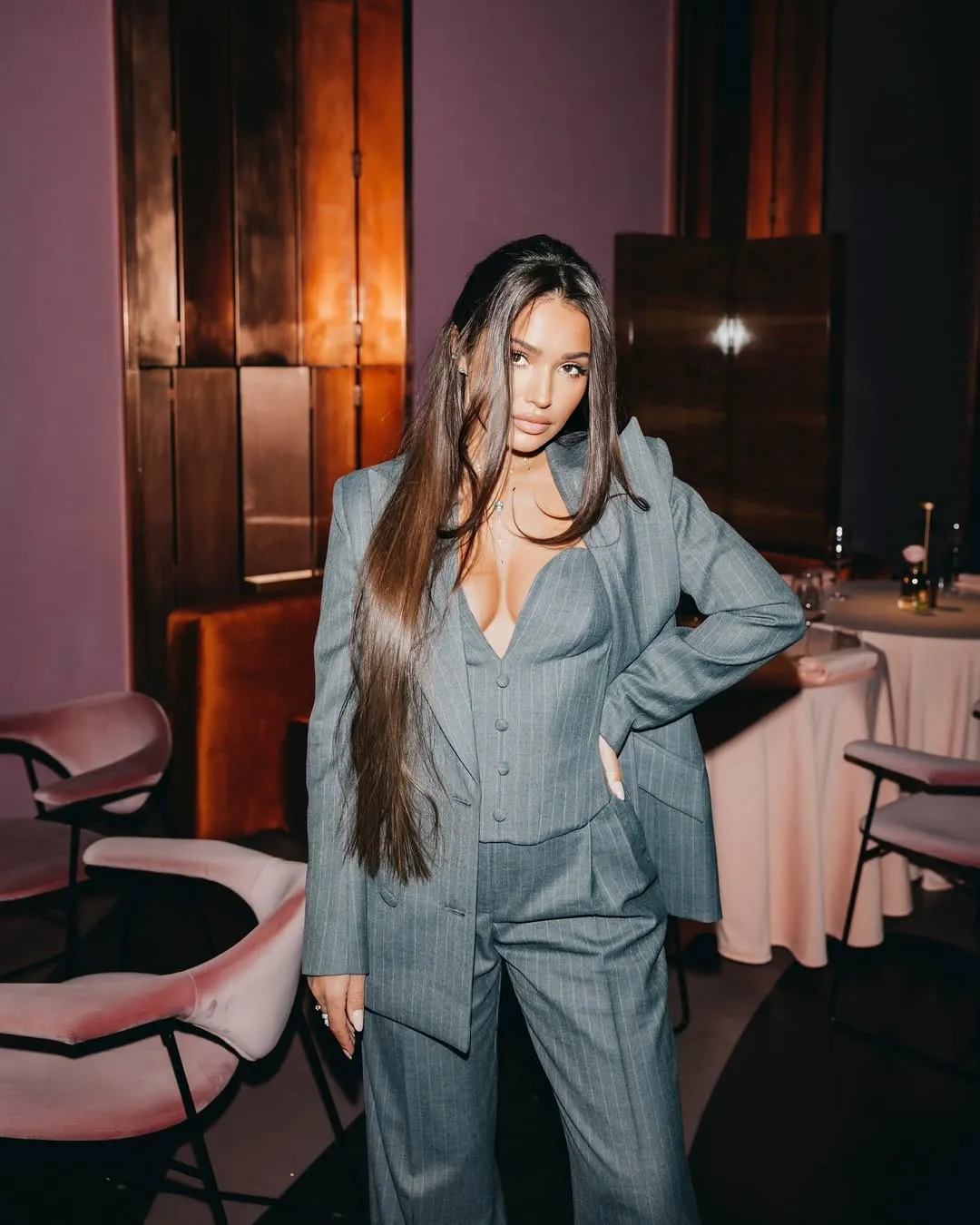 Грациозная ANNA ASTI и тёмно-синий костюм — идеальное комбо! Устоять от такой красоты невозможно. Даже певица решила присесть на кресло.