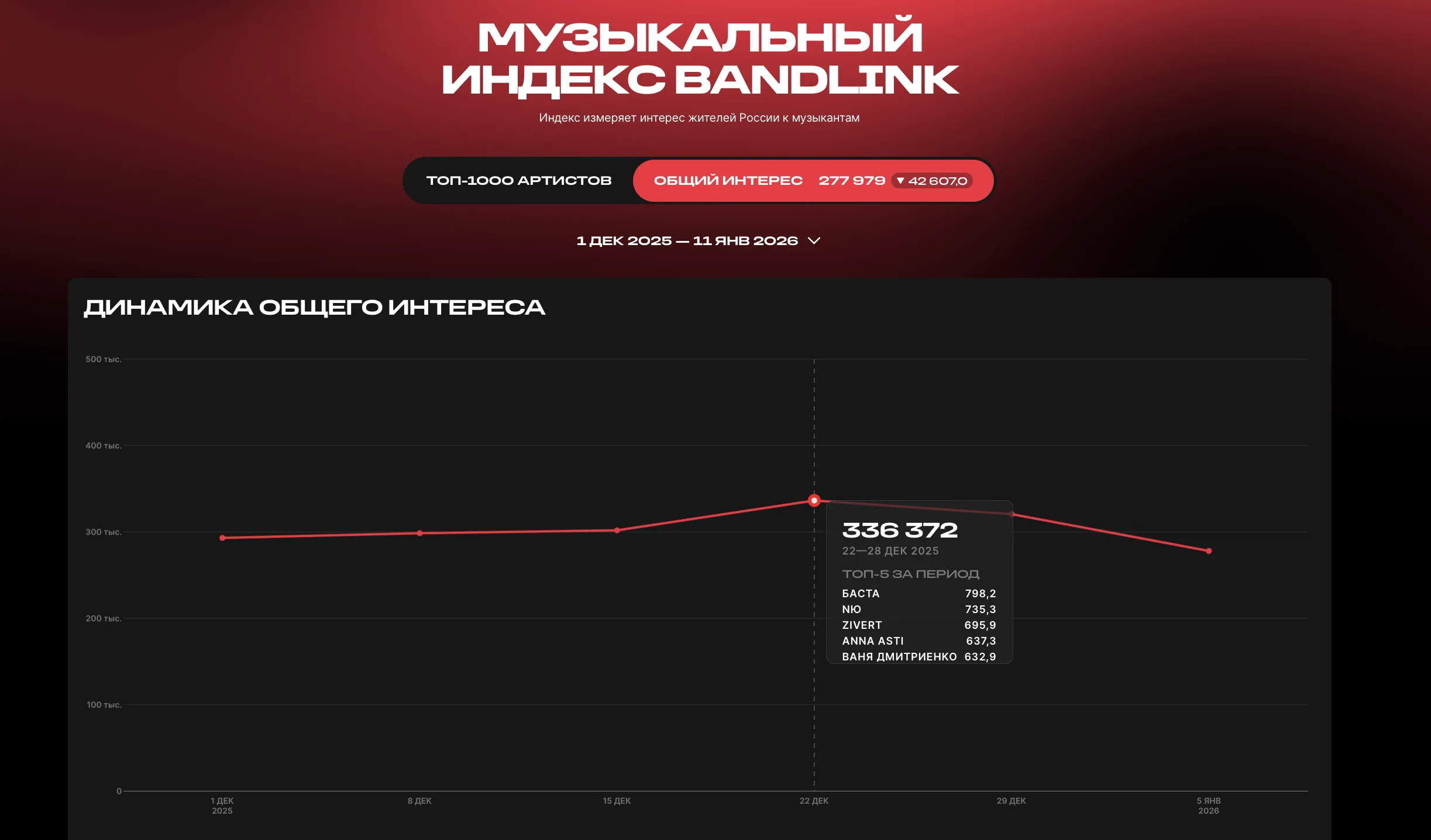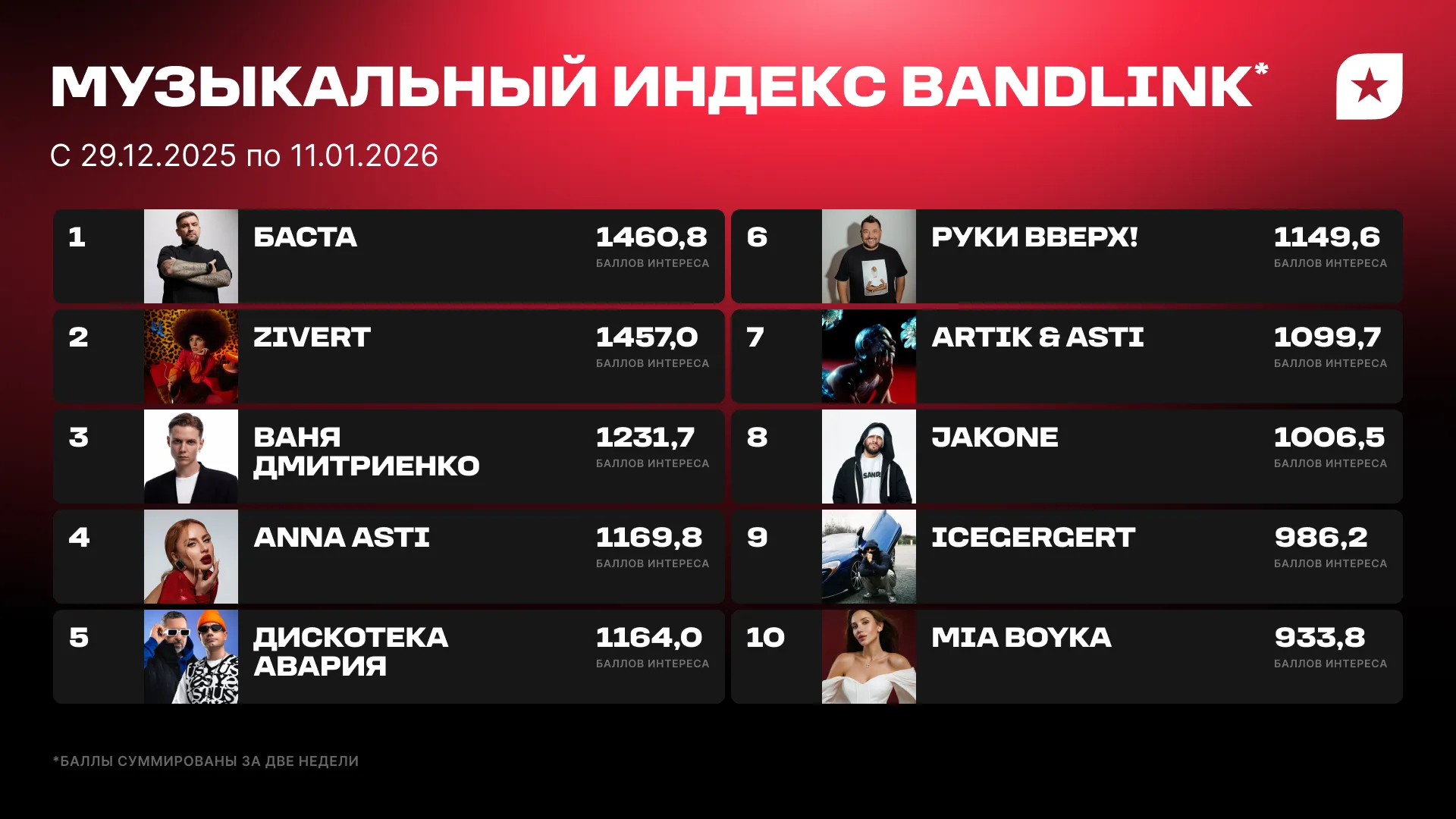 «Музыкальный индекс BandLink» показал, что в минувшие новогодние каникулы россияне чаще всего интересовались Бастой, Zivert, Ваней Дмитриенко, ANNA ASTI, группами «Дискотека Авария» и «Руки Вверх!», ARTIK & ASTI, JAKONE, ICEGERGERT и MIA BOYKA.